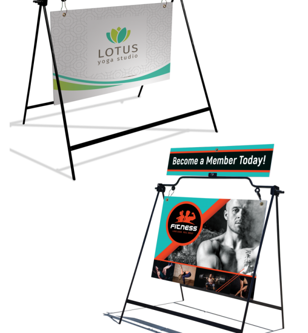 Easy to assemble Sidewalk A-Frames hold 24″ x 18″ Coroplast Signs which hang conveniently from the top of the frame using the included clips. 24″ x 6″, 4mm White Coroplast Rider Signs can be purchased separately in the Signs category and secure to the top of the A-Frame with minimal effort using the attached metal clamp.